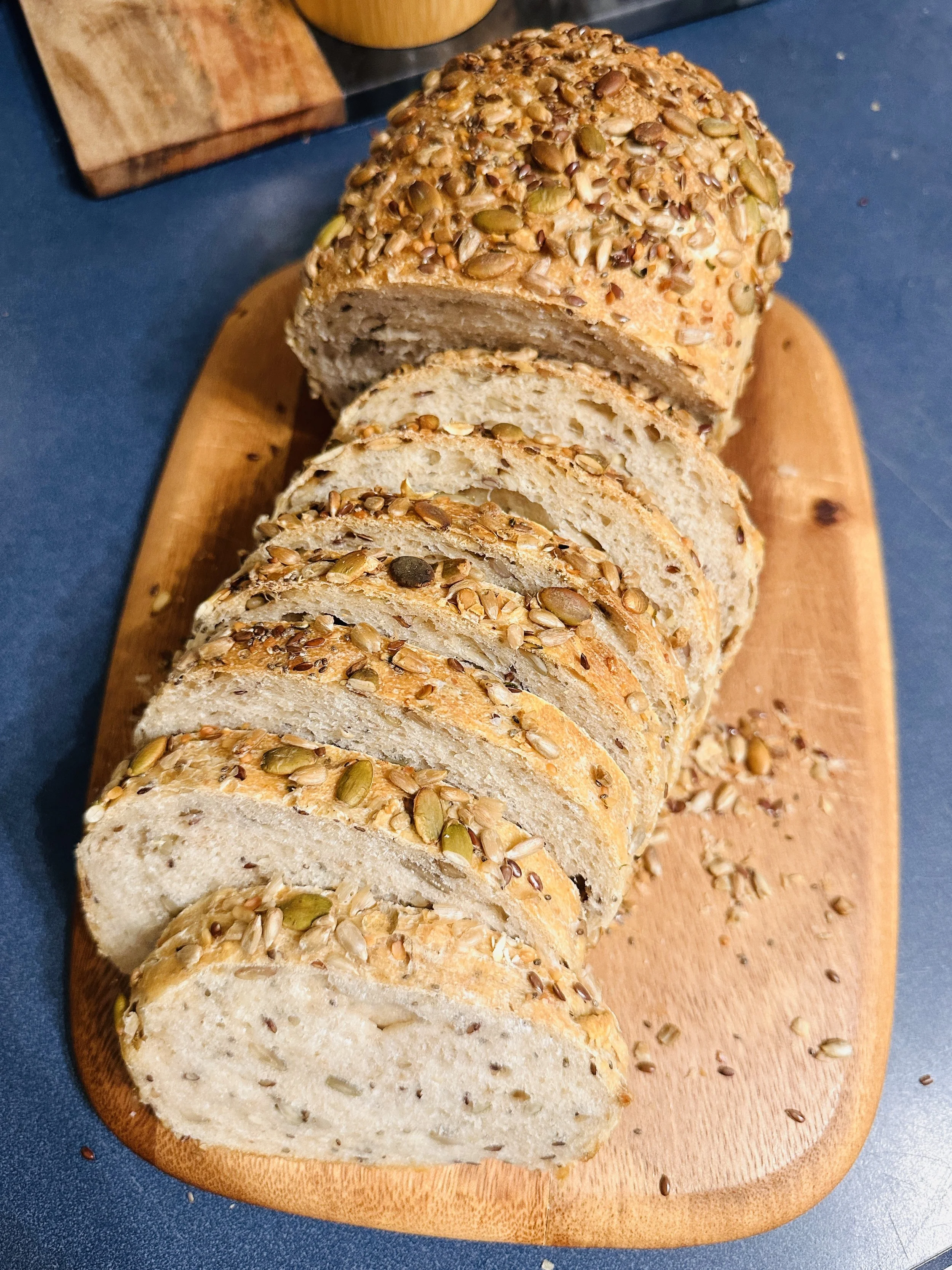 Try this hearty, nourishing loaf with a perfectly soft crumb and a golden, chewy crust. Naturally leavened with active sourdough starter, it’s slow-fermented for deep flavor with improved digestibility. Packed with a wholesome mix of seeds - like sunflower, flax, sesame and pumpkin - this bread delivers a subtle nutty crunch in every bite. It’s sturdy enough for sandwiches, yet tender enough for toasting. This will quickly become an every day favorite!